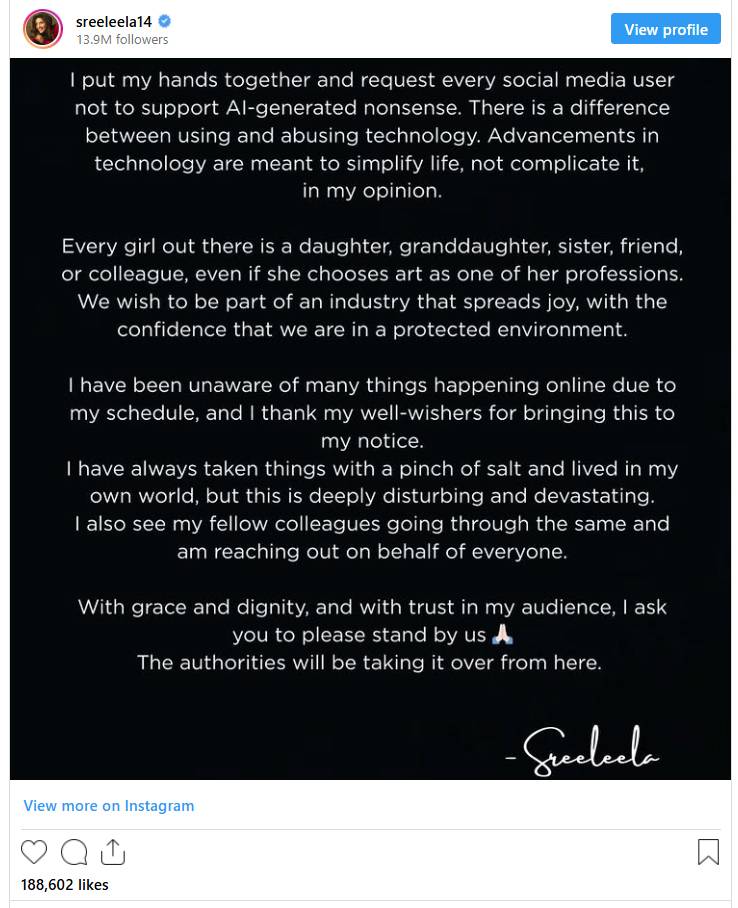 سری لیلا نے سوشل میڈیا پر ایک جذباتی نوٹ شیئر کیا جس میں ان کی اے آئی کے ذریعے تیار کی گئی جعلی تصاویر کے باعث ہونے والی ذہنی اذیت اور صدمے کا اظہار کیا۔